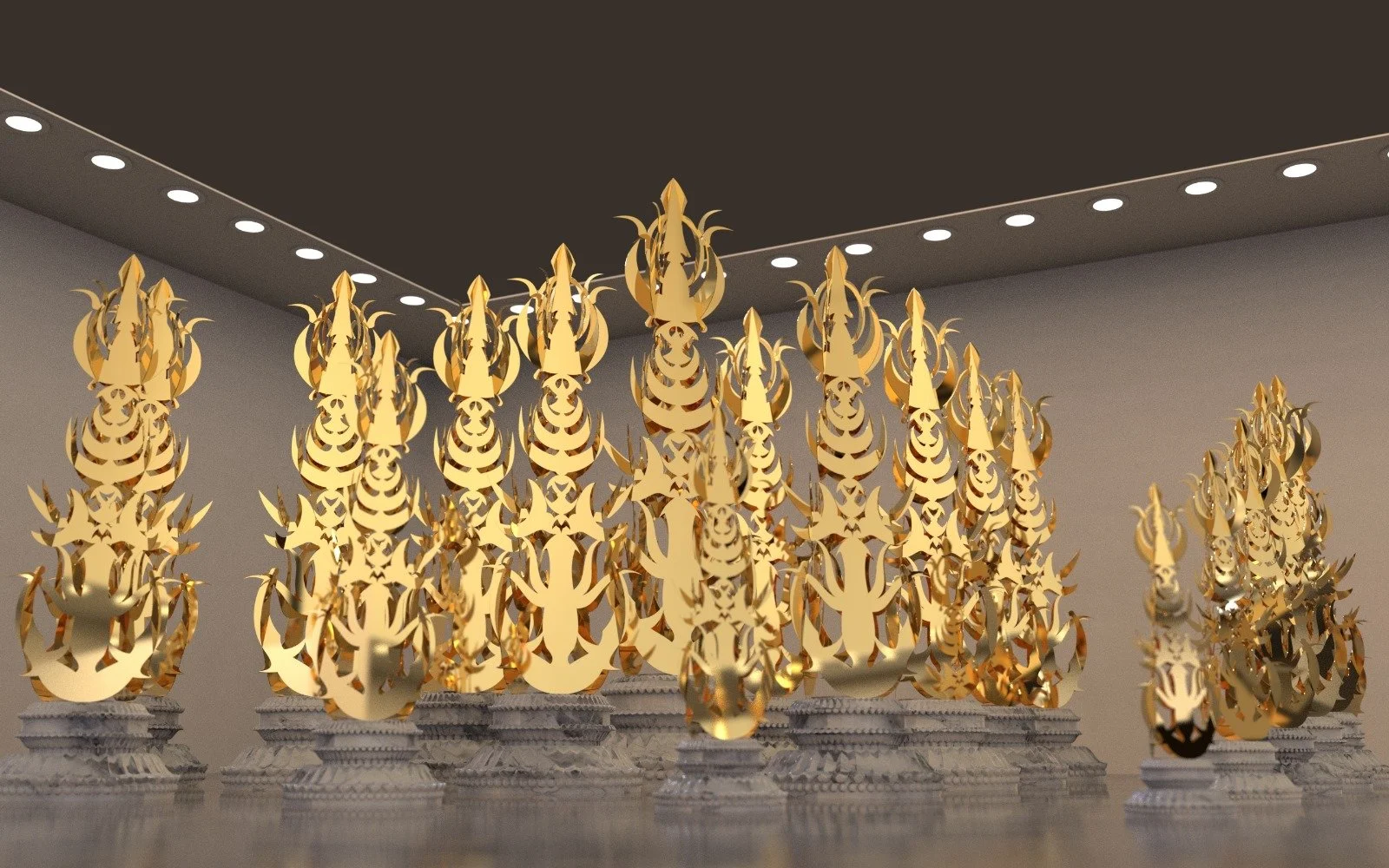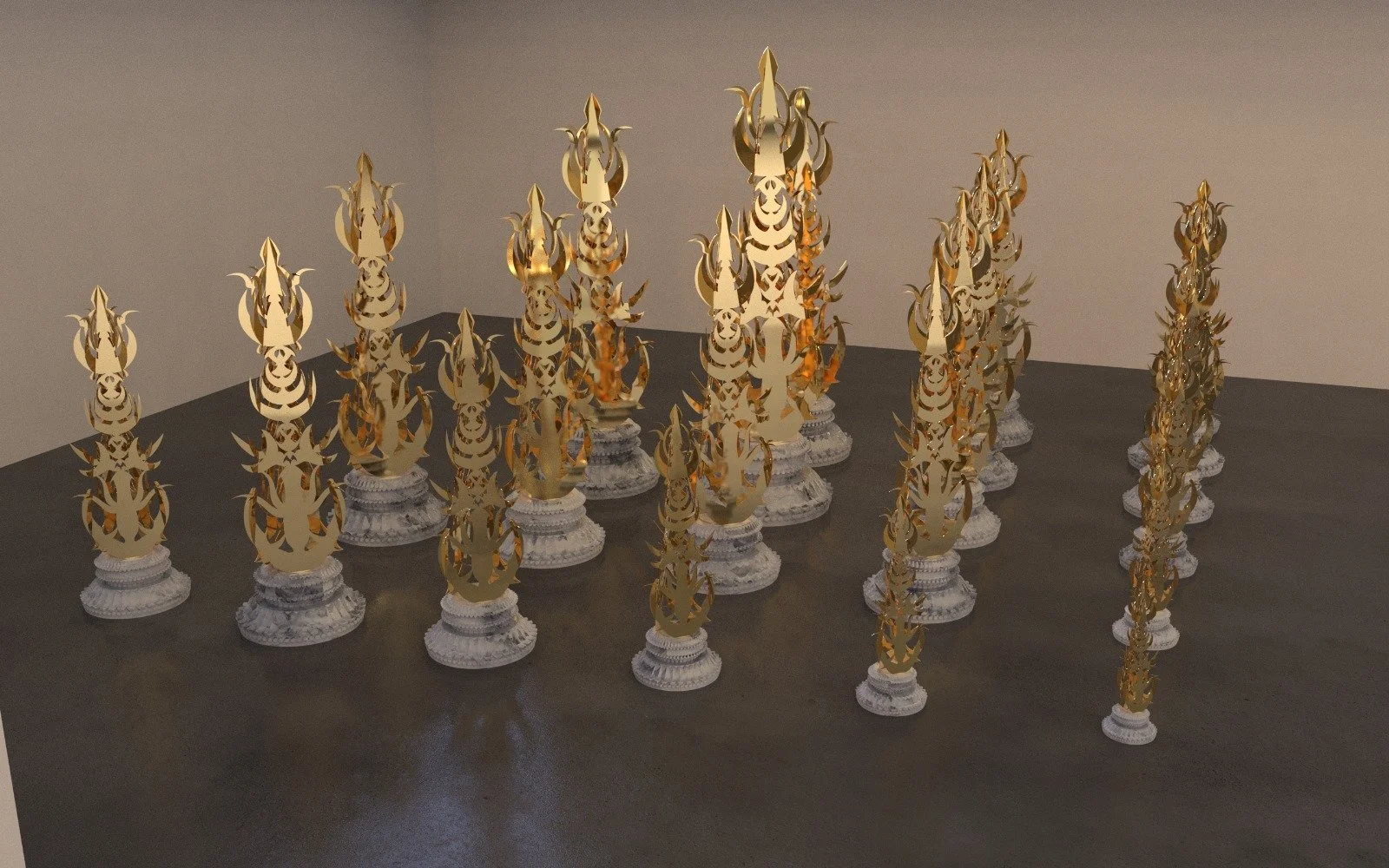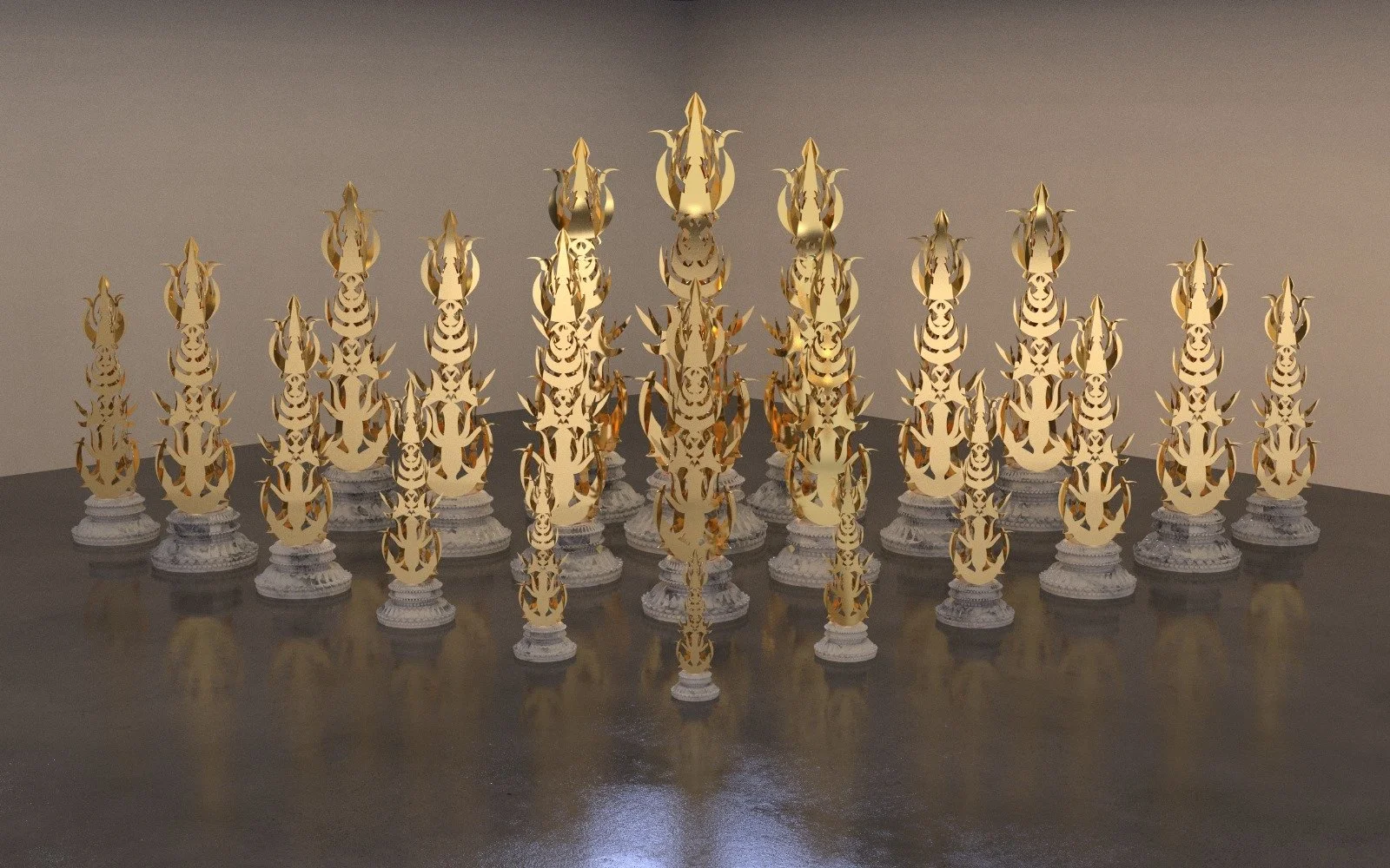 A formation of 21 rising metal pyramids on marble bases. Made to honor the 21 brave Sikh warriors who held their ground against over 5000 opposing soldiers for over 19 hours, Dastar Bunga’s design was inspired by the seminal weaponry on the turban worn by Sikh warriors transmitting a statement of strength and unity through their army.